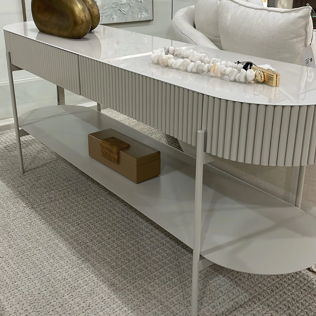 O aparador Line é uma peça de mobiliário que une funcionalidade e estilo contemporâneo. Com duas gavetas, oferece espaço prático para armazenamento, enquanto suas bordas arredondadas em ripado adicionam um toque de elegância e sofisticação. A laca off white confere um acabamento moderno e clean, tornando-o ideal para diversos estilos de decoração. A parte inferior do aparador foi projetada para acomodar decorações, como vasos, livros e outros objetos, proporcionando um visual organizado e estiloso. Este aparador é a escolha perfeita para quem deseja agregar charme e utilidade ao ambiente.