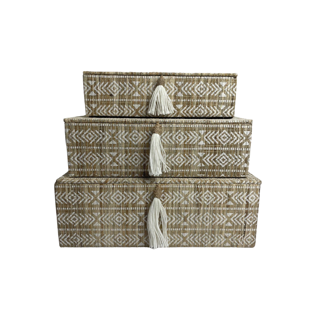 Com um design artesanal e cheio de charme, esta caixa decorativa retangular é feita em fibra natural e traz uma padronagem geométrica em tons claros, perfeita para ambientes que valorizam texturas e elementos naturais. O fecho com detalhe em cordão de juta e pompom de algodão cru adiciona um toque delicado e acolhedor. Ideal para armazenar objetos de forma organizada e elegante, seja em salas, closets ou escritórios.