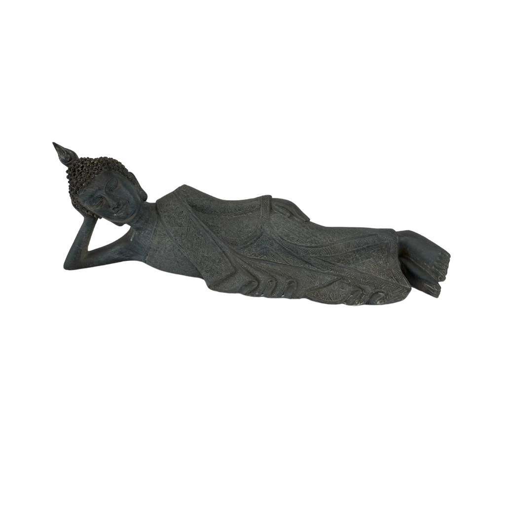 Esta escultura representa o Buda deitado em posição de descanso, símbolo de serenidade, sabedoria e transição para o nirvana. Confeccionada em resina de alta qualidade com acabamento em tom cinza escuro, a peça apresenta detalhes delicadamente esculpidos nas vestes e feições suaves que transmitem paz e equilíbrio. Ideal para compor ambientes voltados à contemplação, relaxamento ou espiritualidade, como halls, salas ou espaços de meditação.