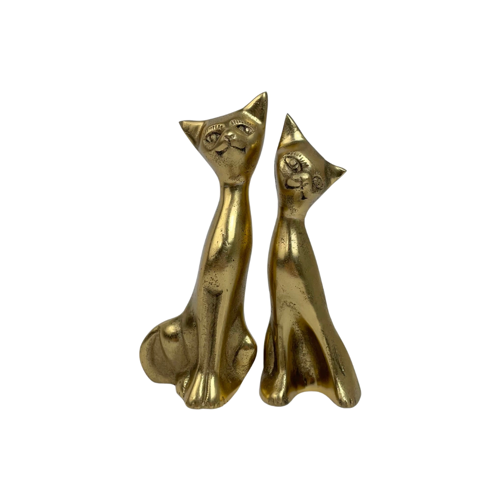 Charmosa dupla de gatos decorativos em latão, com design vintage e traços minimalistas. Ideal para adicionar um toque retrô e elegante à sua decoração. Perfeitos para serem exibidos em estantes, aparadores ou mesas de centro.